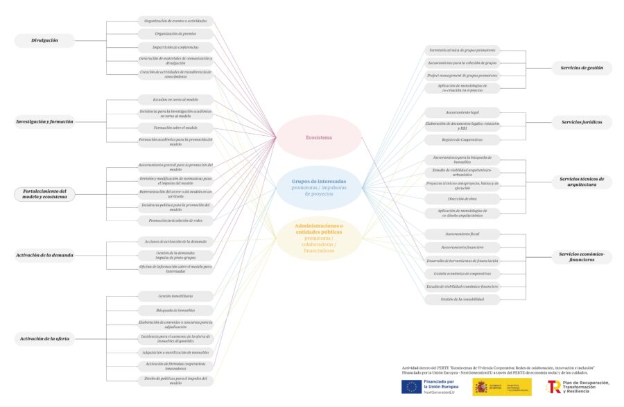 We defined our portfolio of services related to cooperative housing under transfer of use based on an analysis of 21 leading entities at the national and international level. The services offered by these networks, federations, housing developers and professionals in relation to this type of access to housing are very diverse, but can be grouped into dissemination, research and training, model strengthening, demand activation, supply activation, management, legal, technical-architectural and economic-financial services. After observing the diversity of the complete map and analysing Carpe’s experience, resources and current context, a diagnosis is made to determine the main services on which the entity should focus in order to continue contributing to a model that is committed to the decommodification of housing from the perspective of the social economy. This project has been developed within the PERTE ‘Cooperative Housing Ecosystems: Networks of collaboration, innovation and inclusion’. Funded by the European Union – NextGenerationEU through the PERTE for the social and care economy. Translated with DeepL.com (free version) |
